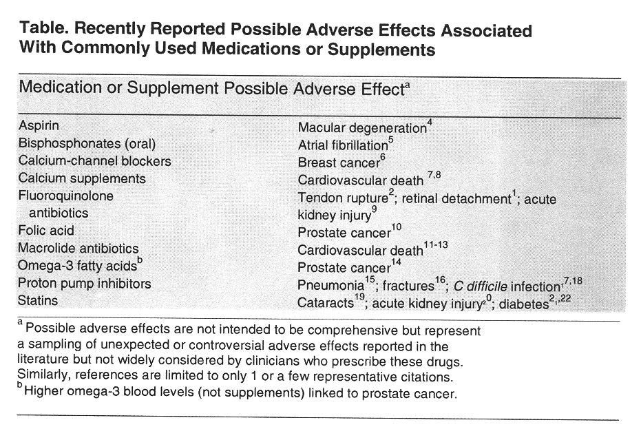 I farmaci moderni sono molto più efficaci di quelli antichi, ma bisogna sempre temere i loro effetti avversi. Un vero farmaco ha quasi sempre anche effetti negativi. La seguente Tabella riporta alcuni di questi per farmaci di uso comune