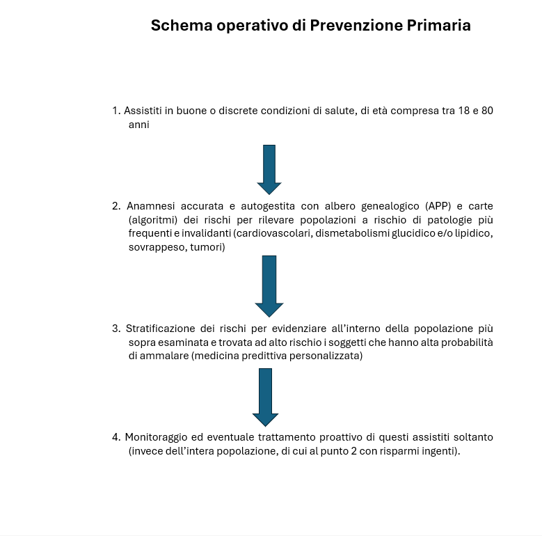 - Il primo punto porta alla ribalta la medicina territoriale e il suo personale sanitario che dovrà anche incaricarsi di effettuare negli assistiti in buone o discrete condizioni di salute una valutazione a basso costo dei rischi che essi hanno di ammalare, così da prevenire che tali rischi si trasformino in malattie, o ritardarne la comparsa (vedi schema operativo). Serve una anamnesi accurata con albero genealogico, una stratificazione dei rischi per individuare i soggetti a più alto rischio individuale e su questi attuare un controllo periodico dello stato di salute con una raccolta e analisi dei dati adatti a mettere in atto le misure necessarie, usando anche una comunicazione con il paziente amichevole e autorevole. La Casa di Comunità sarà a mio avviso determinante per questo fine, ma sarà soprattutto la motivazione dei medici e degli infermieri che ne determinerà il successo. Motivazione che parte dal costruire una carriera e riconoscimenti di merito per la Medicina Generale, alla pari con quanto avviene negli Ospedali, e incluso lo sbocco accademico per i migliori con annessi insegnamento e ricerca. Esperimenti in tal senso, compreso quello che è in corso anche nel Distretto 1 di Milano e che vede anche l’interesse dell’Università Statale di Milano, stanno dando risultati incoraggianti. Se questa prevenzione primaria a costo contenuto produrrà i risultati sperati potremmo ridurre il carico di malattie croniche invalidanti che gravano sul Sistema Sanitario Regionale in modo insostenibile, evitando anche discriminazioni e iniquità inaccettabili