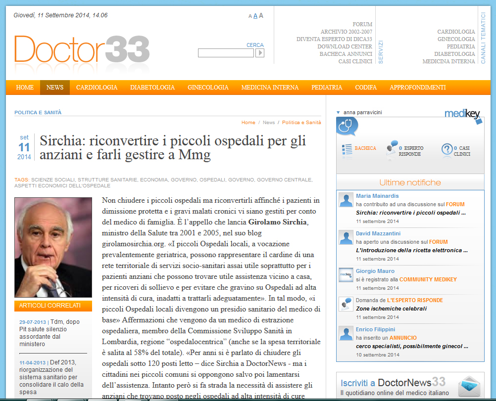 Sirchia: riconvertire i piccoli ospedali per gli anziani e farli gestire a Mmg
